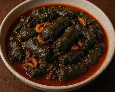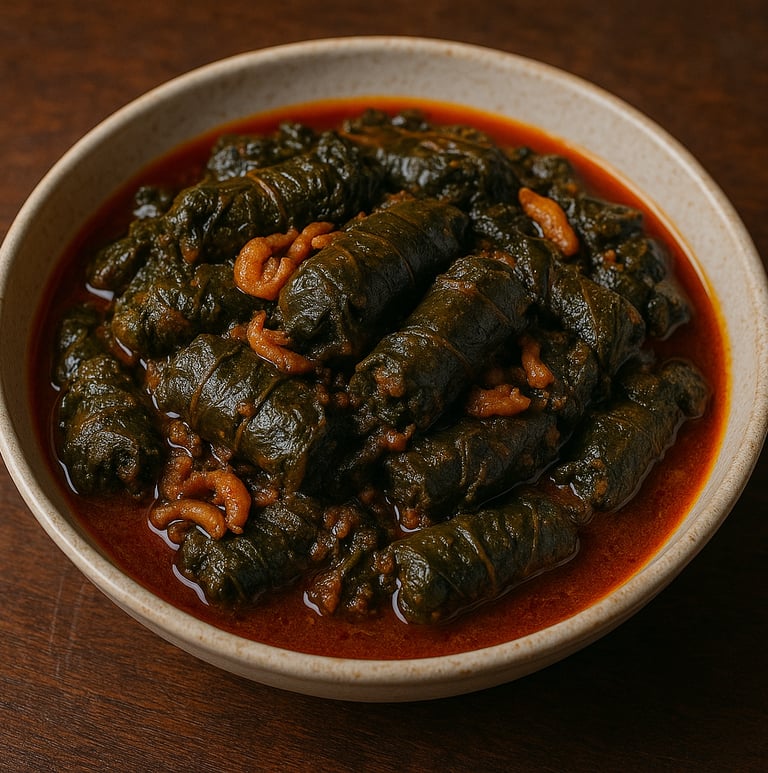 Spécialité camerounaise rare, l’ekwang est fait de taro râpé enroulé dans des feuilles vertes, mijoté dans une sauce d’huile de palme, crevettes séchées et épices. C’est un plat riche, ancestral, et profondément nourrissant.