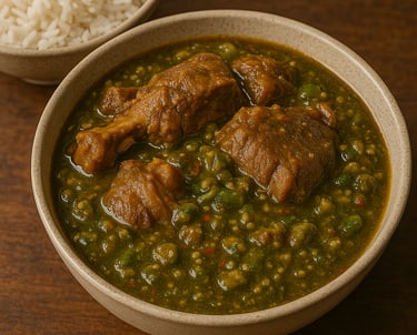 Le ndolé est un plat emblématique du Cameroun. Il est préparé avec des feuilles amères, une pâte d’arachide onctueuse et des épices locales. Servi avec un poisson entier grillé au feu de bois, ce plat est un véritable hommage aux traditions culinaires camerounaises.