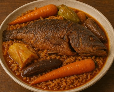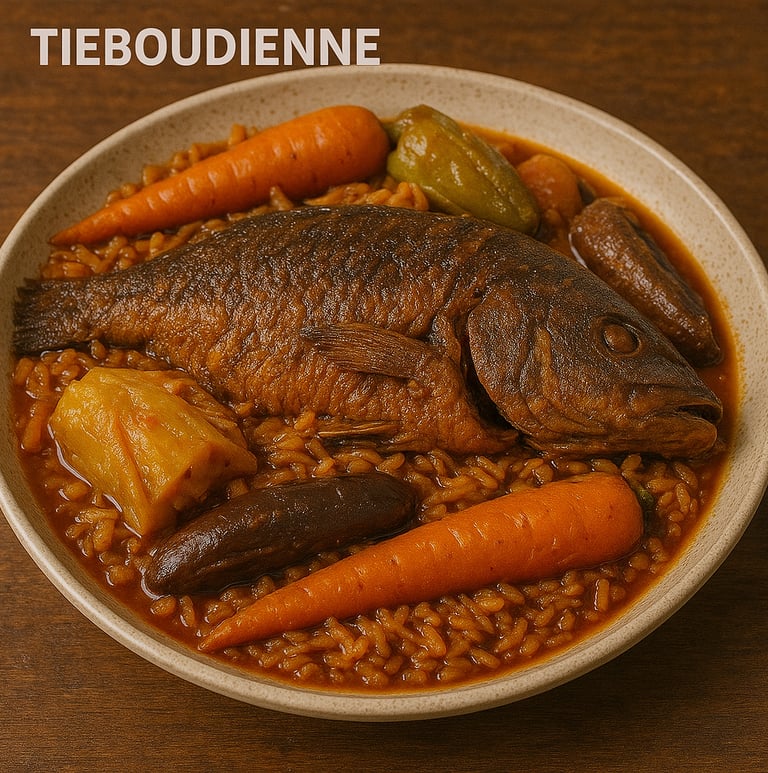 Le fameux “thiéboudiène” est composé de riz long parfumé, de légumes colorés et de poisson braisé, le tout mijoté ensemble dans une sauce tomate épicée. C’est un plat généreux et emblématique de la culture culinaire sénégalaise.